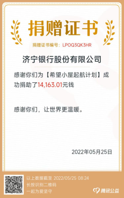 一间小屋、无限希望,涓涓细流汇成大海,颗颗爱心点亮希望。下一步,济宁银行将秉承公益情怀,牢记担当使命,积极投身社会公益活动,为社会公益事业添砖加瓦。