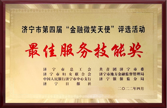 近日,济宁市第四届“金融微笑天使”评选活动圆满落幕,济宁银行荣获“最佳服务技能奖”,张丽丽、张建美、张慧芳、张荣贵4名同志被评为“金融微笑天使”,张丽丽被市总工会授予“五一”劳动奖章,张建美被市妇联授予“巾帼岗位明星”荣誉称号。