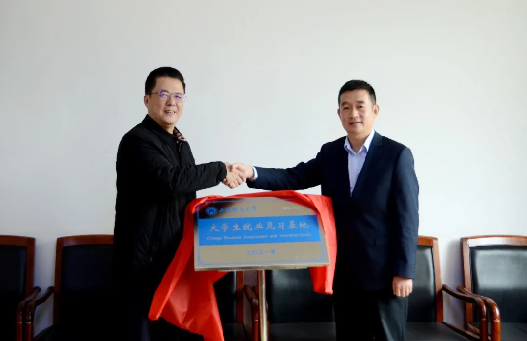 杨哲与陈亮代表双方签署了就业见习基地合作协议并共同为见习基地揭牌,学校向陈亮颁发了“山东财经大学就业导师”聘书。